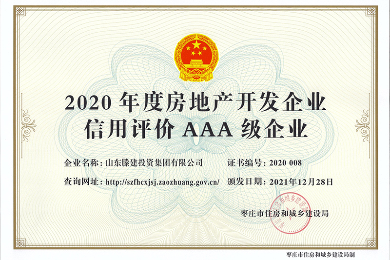 近期,棗莊市住房和城鄉(xiāng)建設(shè)局發(fā)布了2020年度全市房地產(chǎn)開發(fā)企業(yè)信用等級評定結(jié)果。山東滕建投資集團(tuán)有限公司憑借在企業(yè)客觀信用能力、經(jīng)營信用情況、社會(huì)信用等方面出色的綜合實(shí)力,榮獲2020年AAA級房地產(chǎn)開發(fā)企業(yè)最高信用等級。房地產(chǎn)開發(fā)企業(yè)信用評定是棗莊市住房和城鄉(xiāng)建設(shè)局依據(jù)《棗莊市房地產(chǎn)開發(fā)企業(yè)信用評價(jià)實(shí)施細(xì)則